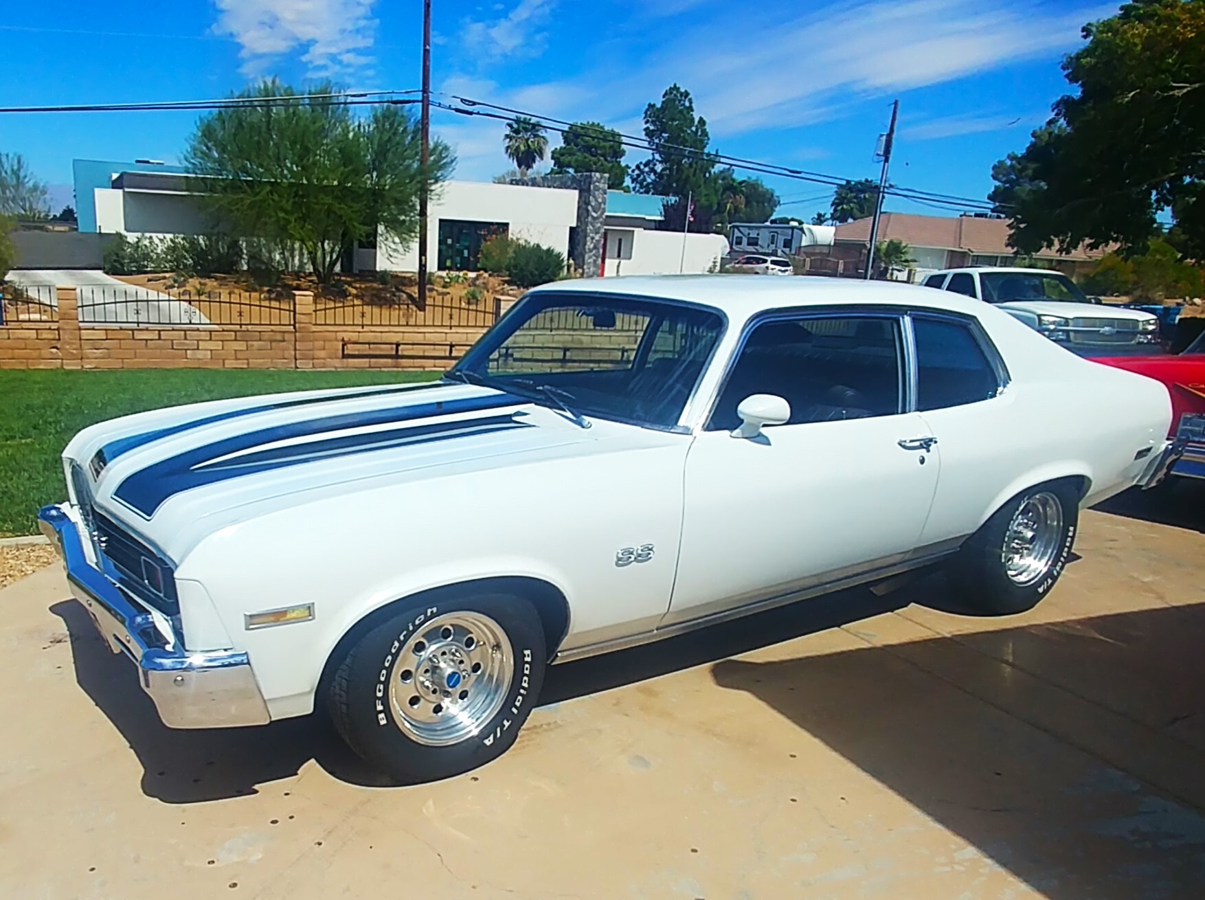 No detail has gone untouched. The Nova has big drilled and slotted 4 wheel disk brake rotors, a huge aluminum radiator, anti-sway bars, traction bars, and power steering, air conditioning, an Auto Sound stereo system, and custom fabricated black interior featuring a bench seats with embroidered SS stitching front and back. The factory SS package headliner with the huge sculpted SS logo still remains. As a tribute to the time the car was built, it also still rides on the Centerline rims that were popular at the time.