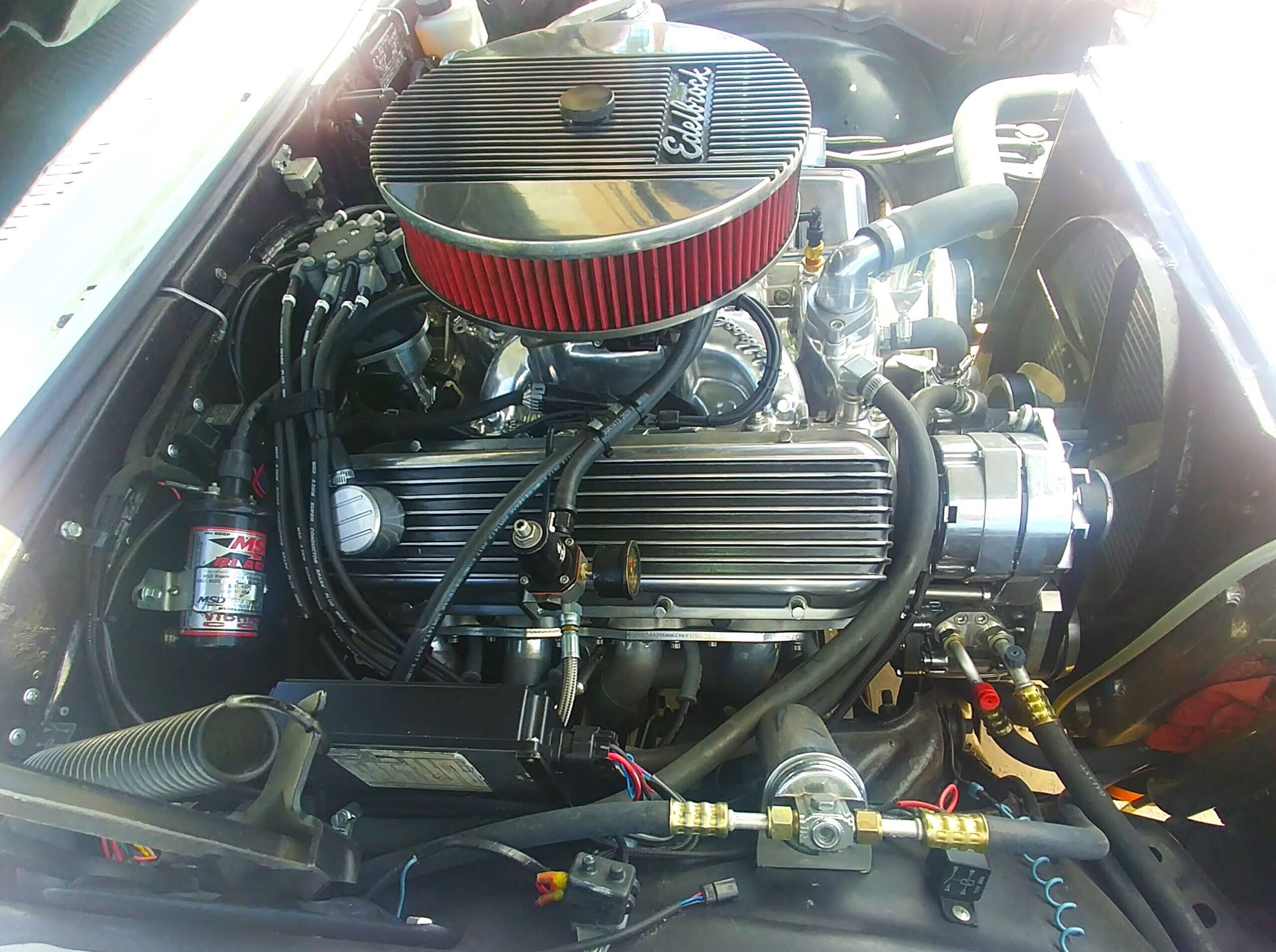 NOW THIS CAR IS A GENUINE MUSCLE CAR. Under the cowl induction hood, it rocks a 454 CID big block V8, assembled to produce well north of 500 horsepower. All new from the crankcase to the air cleaner, this engine has all the best stuff money can buy. And, it is all BC stuff – Before China. Every part is American made and from the harmonic balancer to the competition built rear end, is precision made and documented. The engine internals include SCAT high performance parts. A forged steel crank, connecting rods, and pistons, Edelbrock 10.5:1 compression aluminum heads, Crane roller rockers, custom fabricated long tube headers, and Holley Sniper 2 ignition and fuel injection make this little car roar.